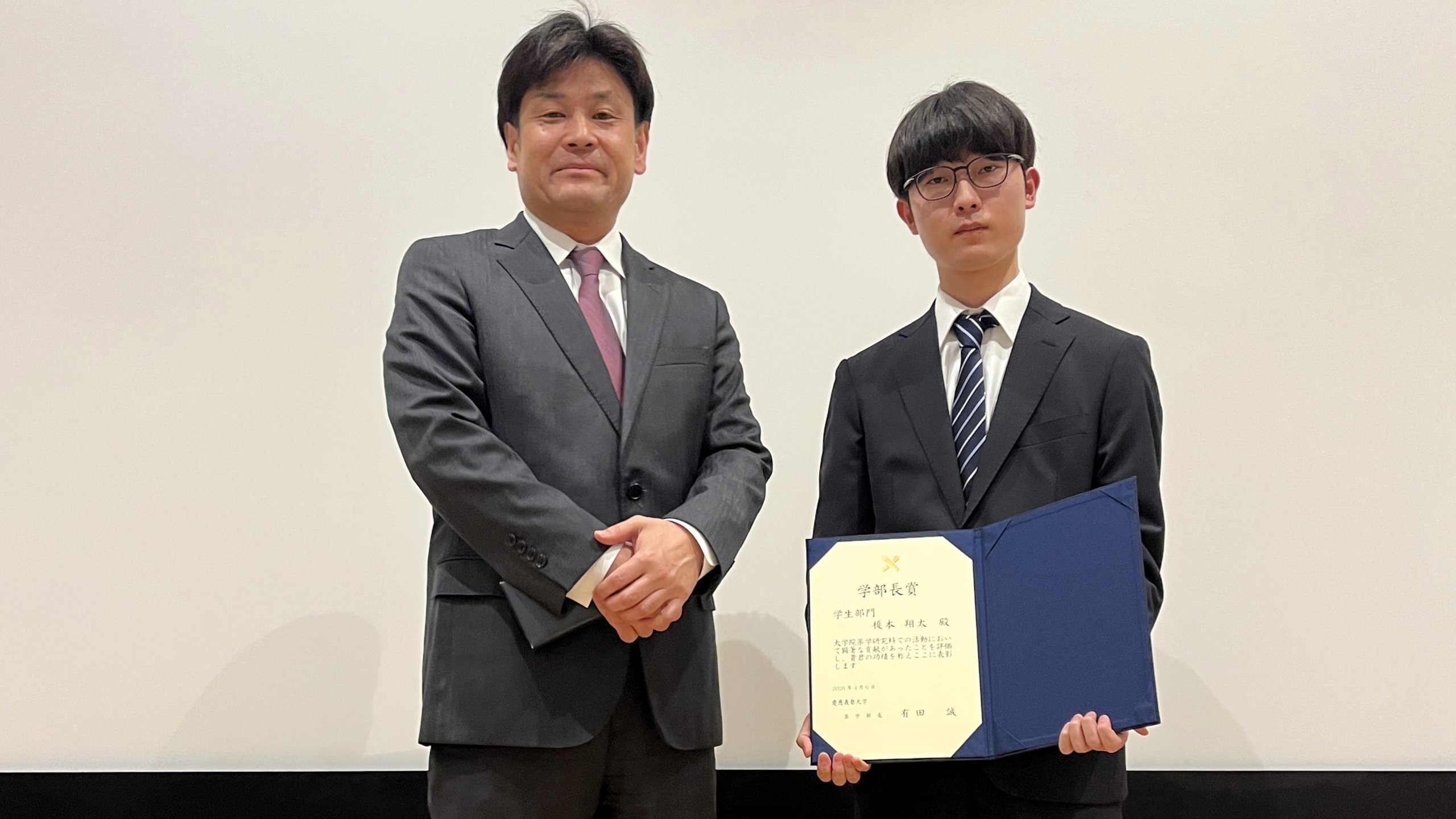4月6日(月)、有田 誠 薬学部長から榎本君に表彰状と記念品が授与されました。